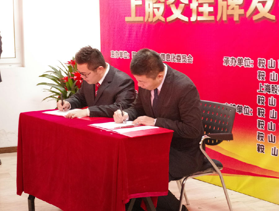 E板簽約儀式:上海鼎洪投資管理有限公司駐沈陽孵化基地投資總監(jiān)王鵬和鞍山市春成保溫材料廠總經(jīng)理徐冰。